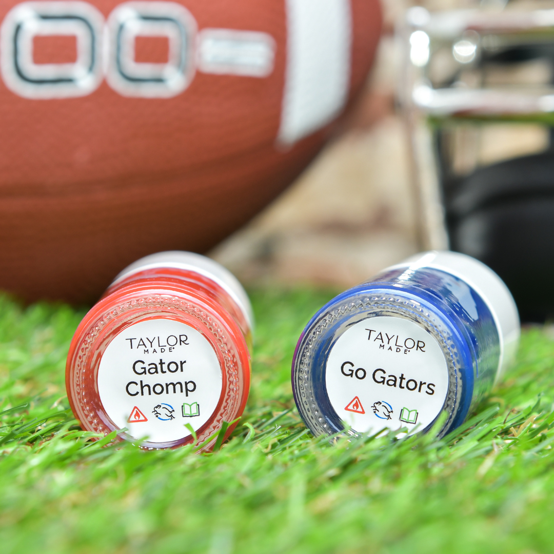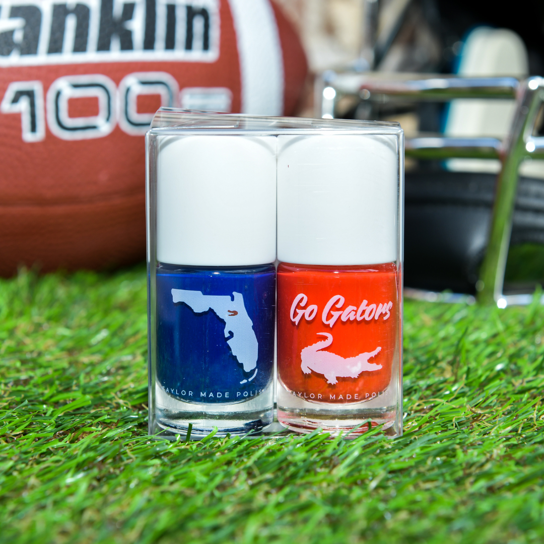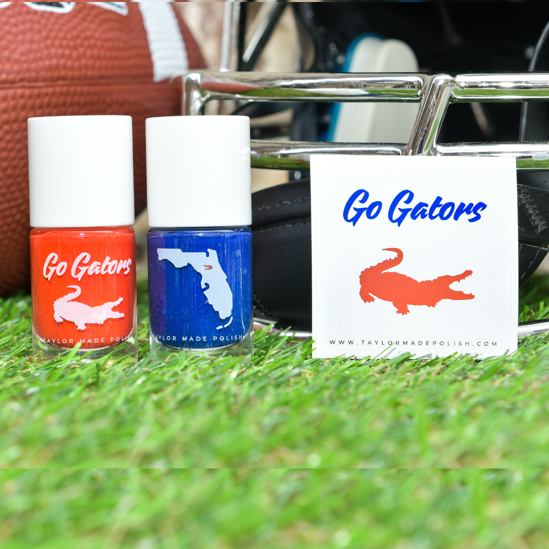 Level up your Game Day OOTD and show your Florida Gator pride with “Gator Chomp” (orange) and “Go Gators” (blue). Glossy cream coat polish with a quick dry finish.