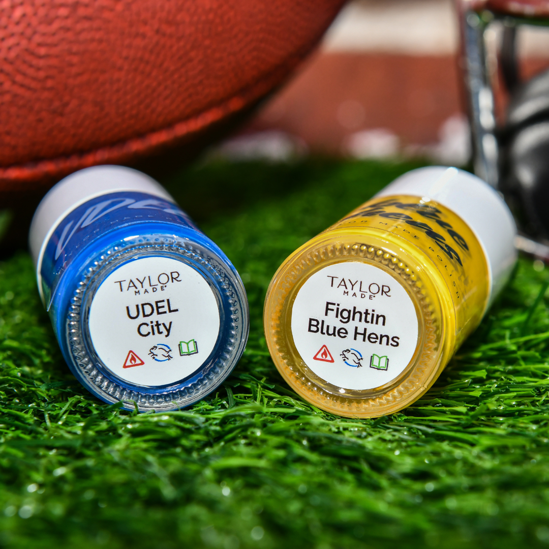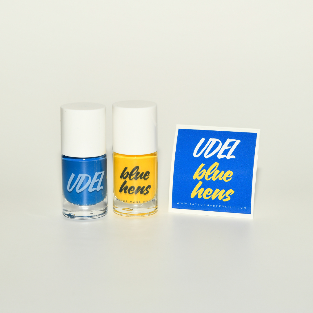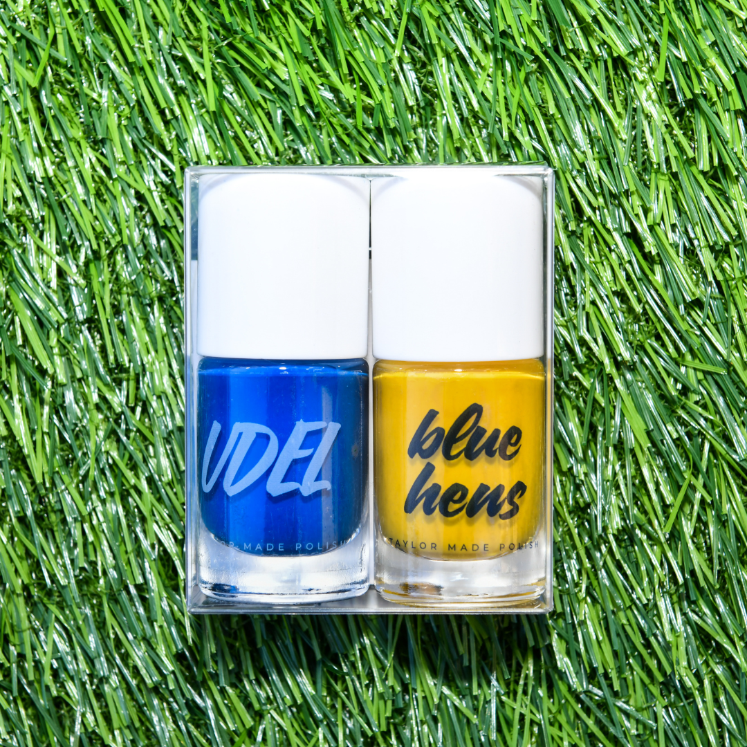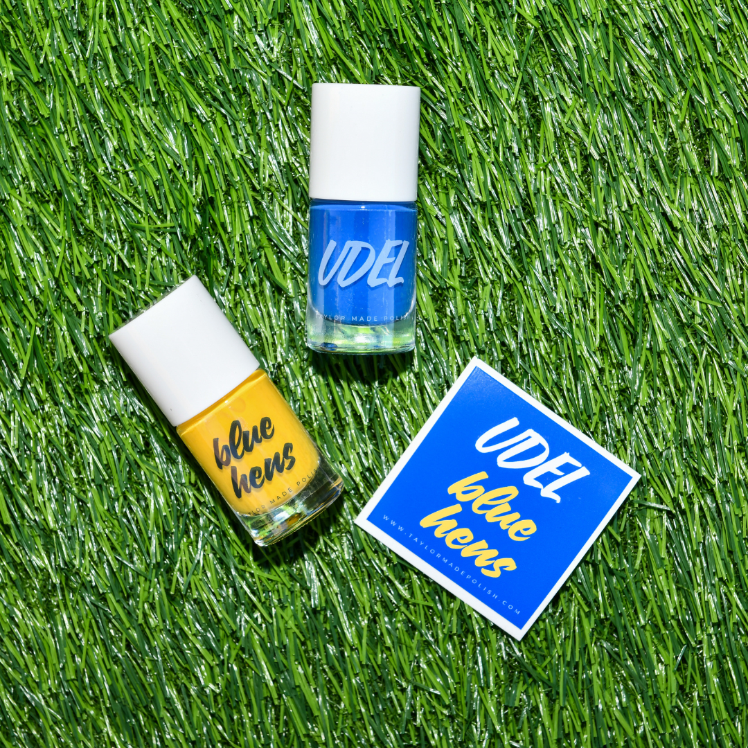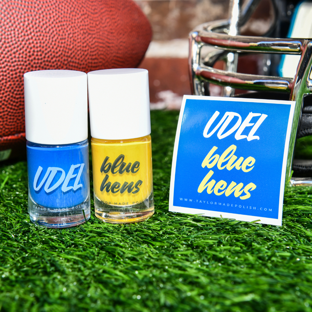 Designed to bring the spirit and excitement of college sports directly to your fingertips! Show your school spirit with “UDel City” (blue) and “'Fightin' Blue Hens” (yellow). Both shades are a glossy cream coat polish with a quick dry finish.