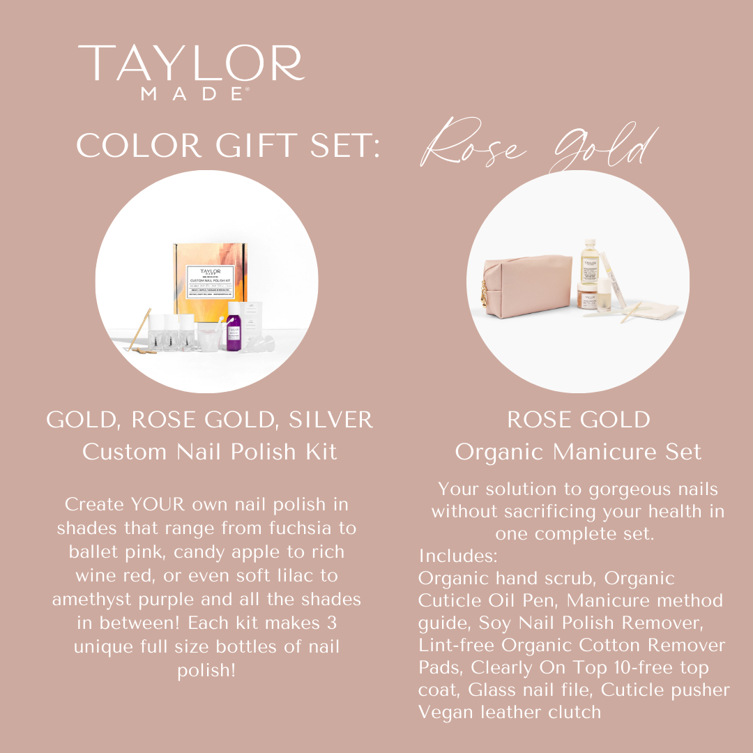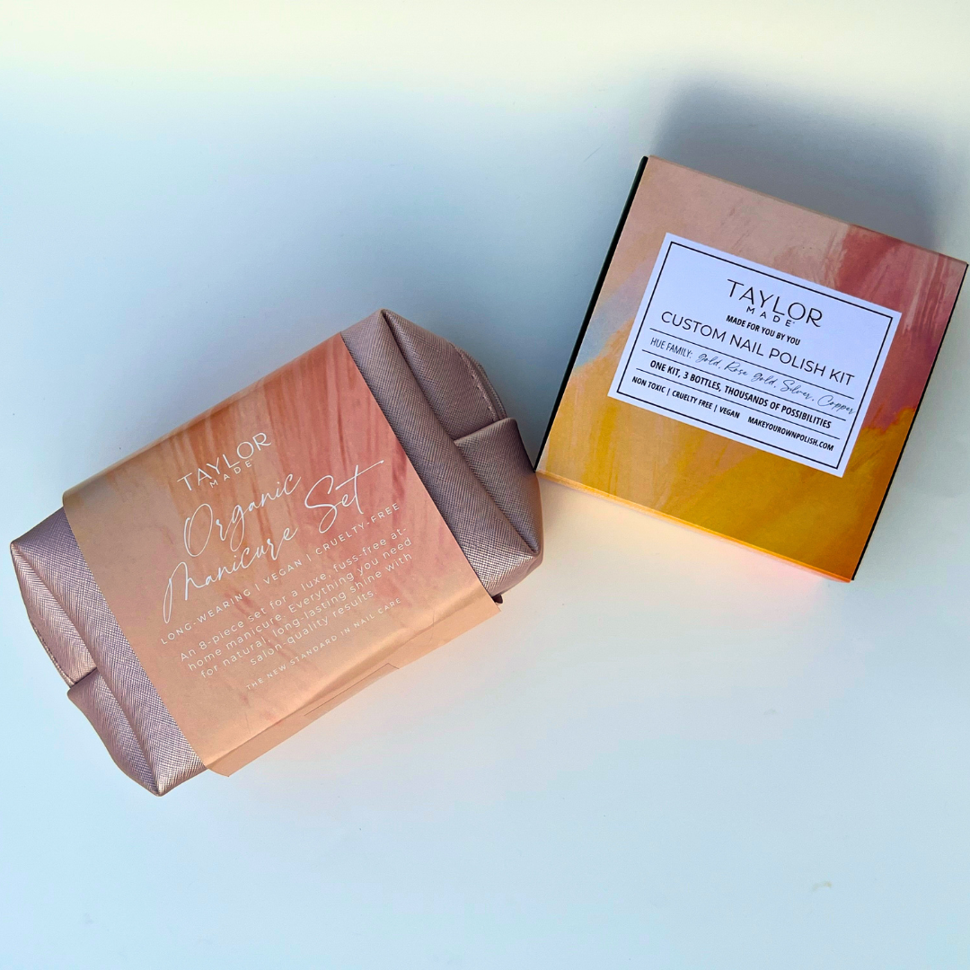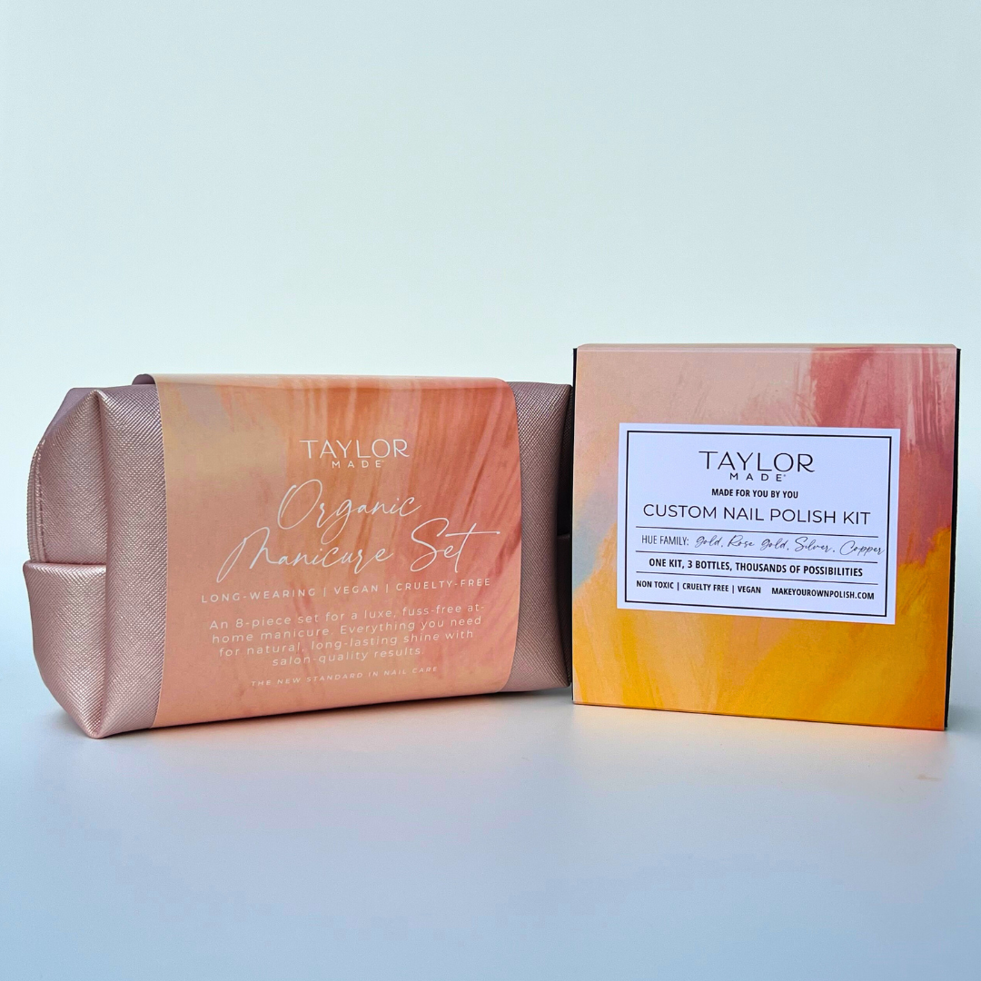 The perfect fusion of creativity and self-care! This thoughtfully curated set combines a Custom Nail Polish Kit and a luxurious Organic Manicure Set. Craft a personalized shade and elevate nail care to a whole new level. Available in multiple colorways – a timeless, personalized gift for every occasion. Give the gift of creativity, elegance, and conscious beauty with Taylor Made Polish.
