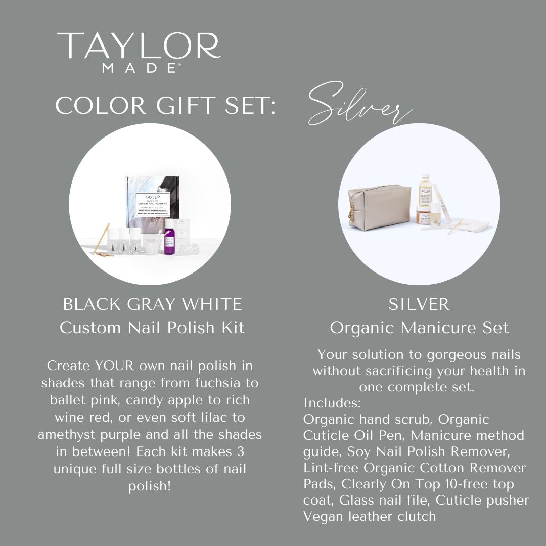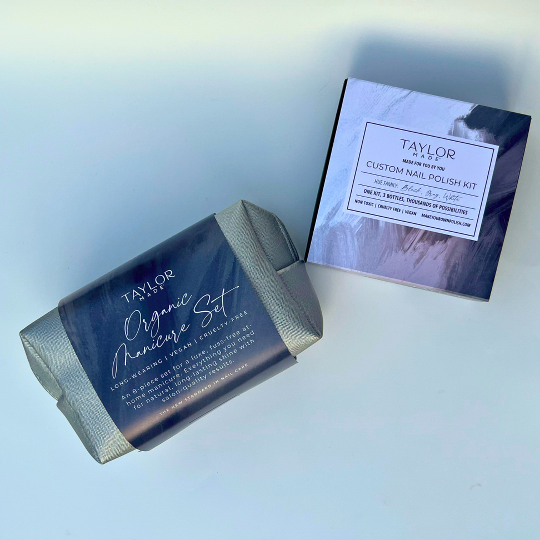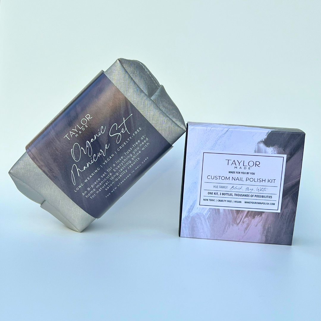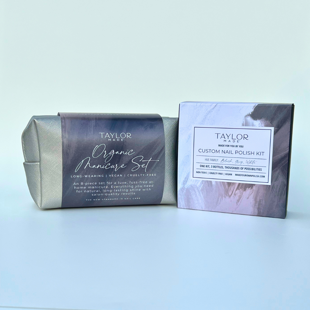The perfect fusion of creativity and self-care! This thoughtfully curated set combines a Custom Nail Polish Kit and a luxurious Organic Manicure Set. Craft a personalized shade and elevate nail care to a whole new level. Available in multiple colorways – a timeless, personalized gift for every occasion. Give the gift of creativity, elegance, and conscious beauty with Taylor Made Polish.