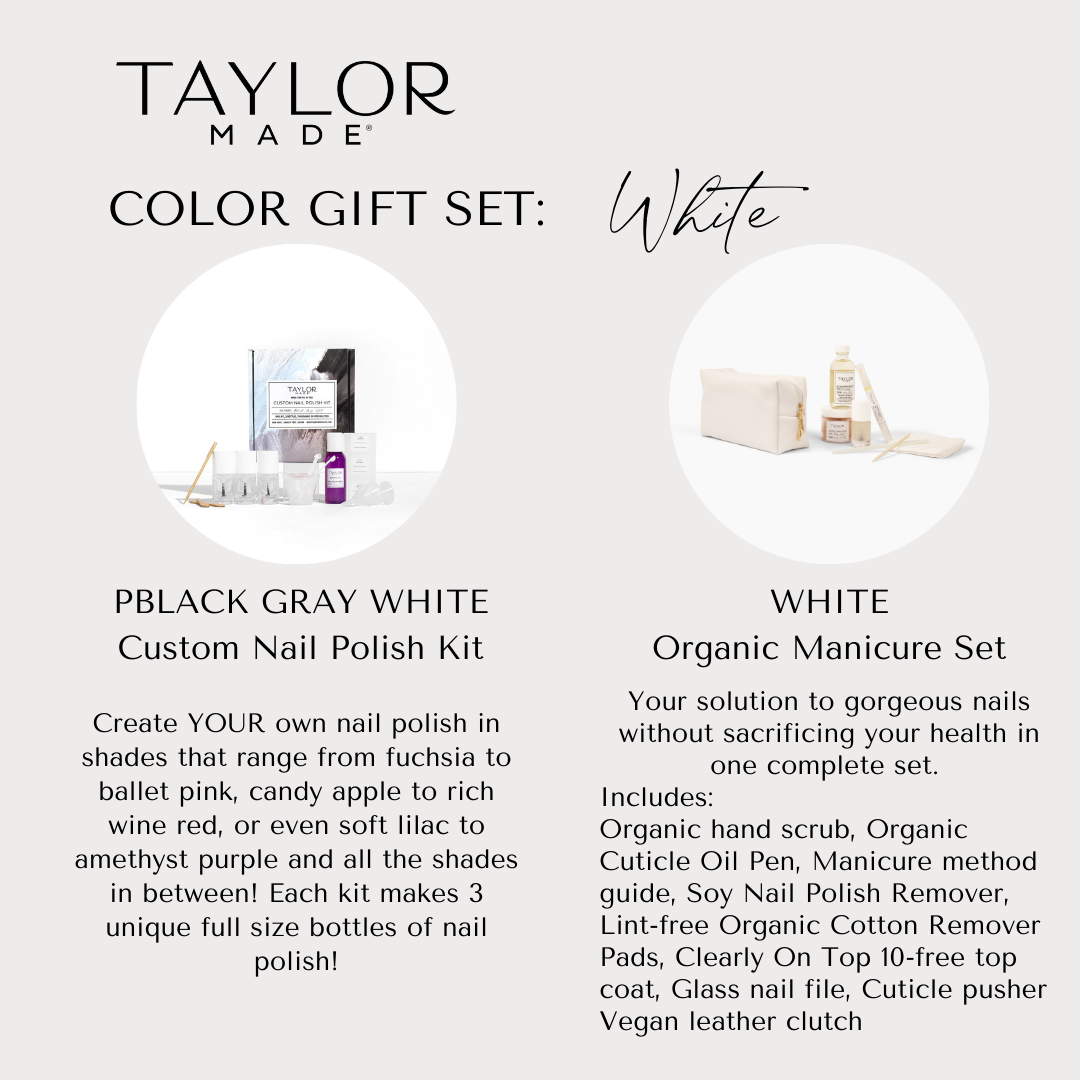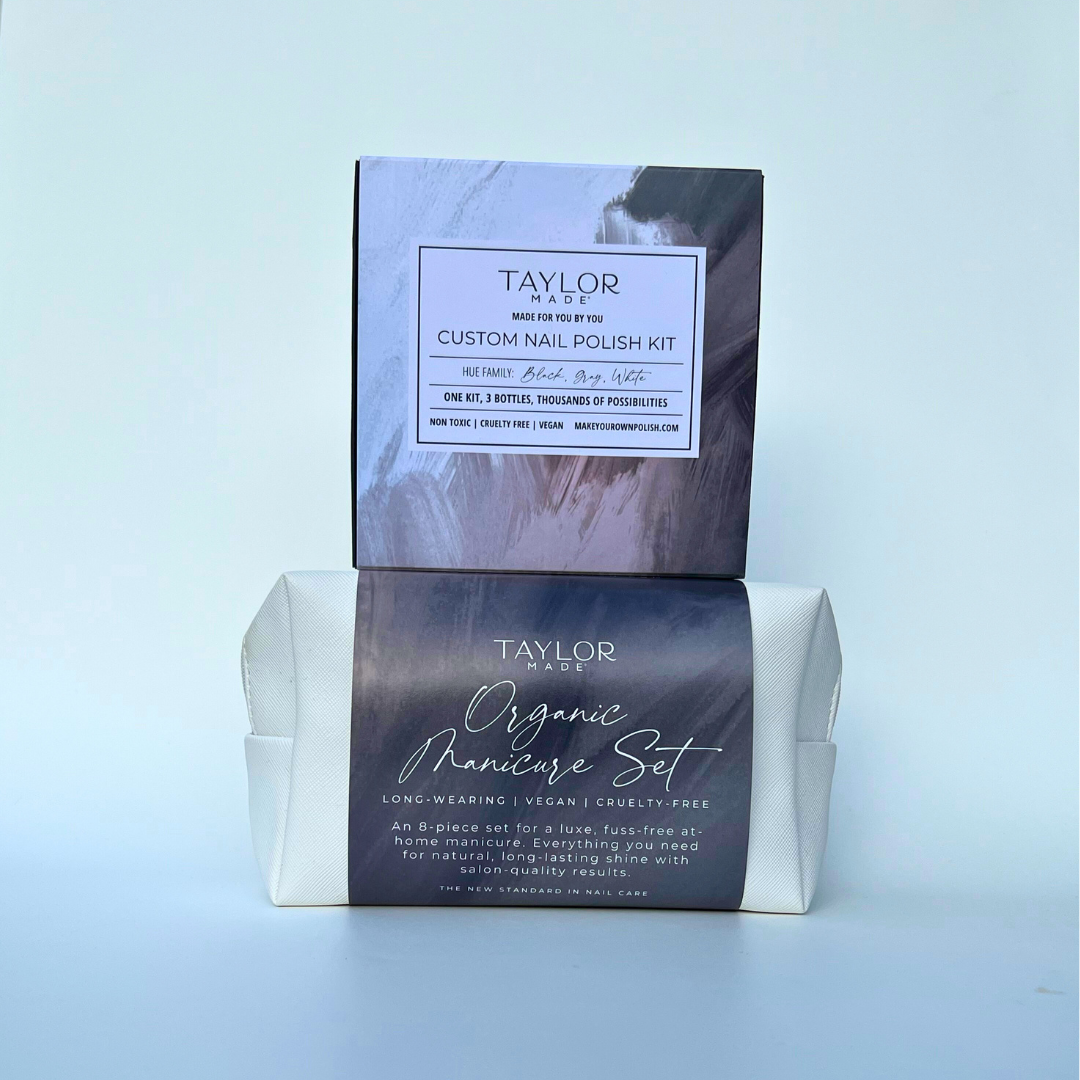 The perfect fusion of creativity and self-care! This thoughtfully curated set combines a Custom Nail Polish Kit and a luxurious Organic Manicure Set. Craft a personalized shade and elevate nail care to a whole new level. Available in multiple colorways – a timeless, personalized gift for every occasion. Give the gift of creativity, elegance, and conscious beauty with Taylor Made Polish.