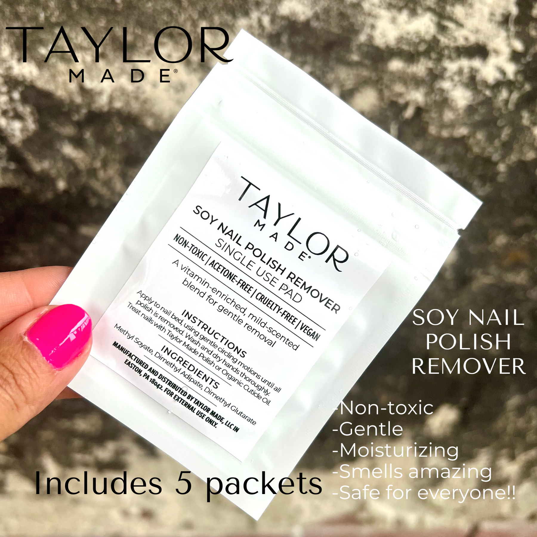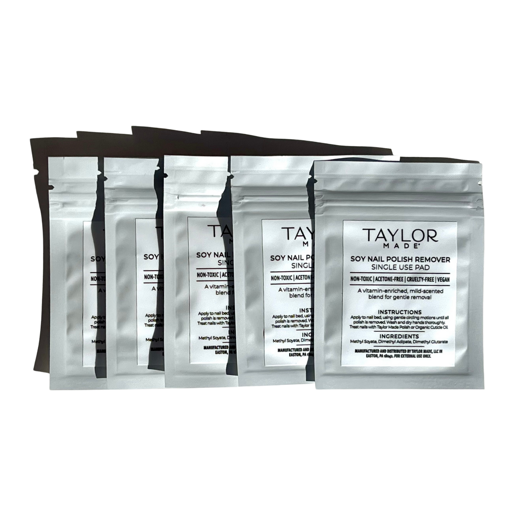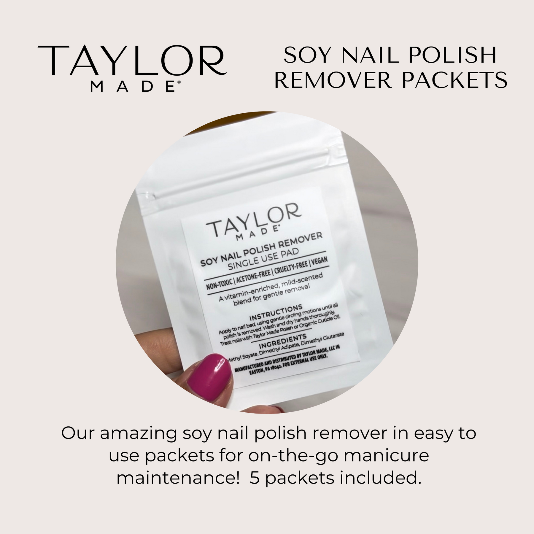 Single-use Soy Polish Remover with our travel wipes in resealable pouch.  Set of 5 wipes.