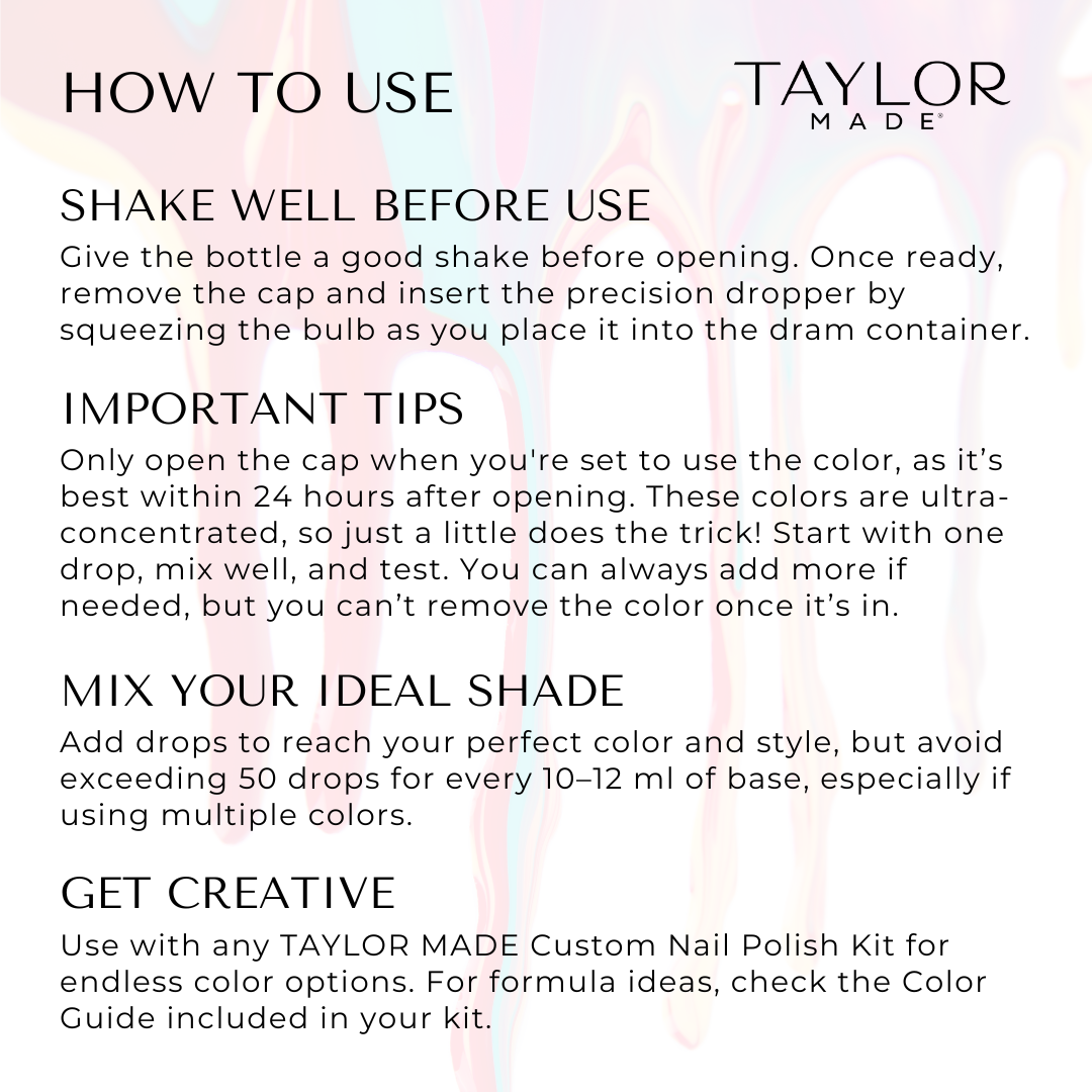Liquid Concentrate colors are crafted to enhance your TAYLOR MADE Custom Nail Polish Kits. Each bottle contains a single concentrated liquid colorant, specifically formulated to blend seamlessly into nail polish base—not to be worn alone. Be sure to mix it with a nail polish base to create your custom shade!