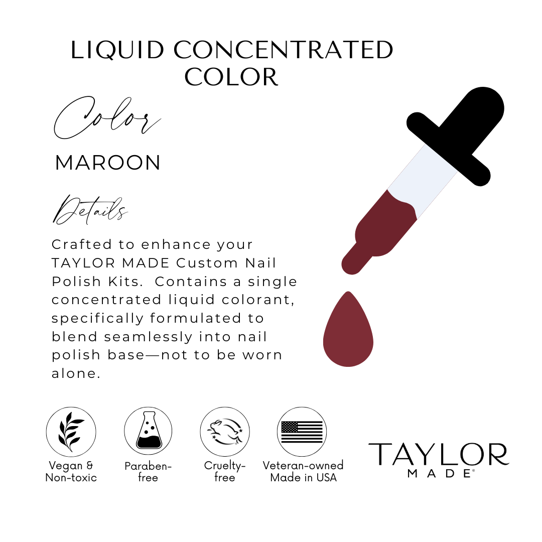 Liquid Concentrate colors are crafted to enhance your TAYLOR MADE Custom Nail Polish Kits. Each bottle contains a single concentrated liquid colorant, specifically formulated to blend seamlessly into nail polish base—not to be worn alone. Be sure to mix it with a nail polish base to create your custom shade!